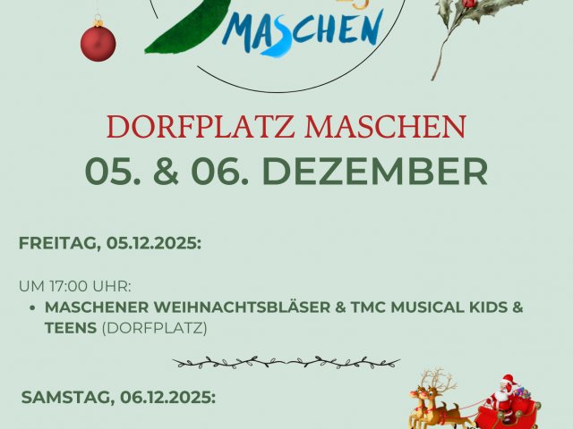 Am Freitag, den 5. Dezember startet der Weihnachtsmarkt ab 17 Uhr auf dem Dorfplatz (Schulstraße 55) mit den Maschener Weihnachtsbläsern und den TMC Musical Kids & Teens. Bei Glühwein, Punsch und Würstchen kommt dabei ganz bestimmt Weihnachtsstimmung auf. Auch die Pop-up-Box lädt zum Bummeln ein. Am Samstag öffnet der Markt bereits ab 15 Uhr. Der Nikolaus kommt in die Pop-up-Box und im Dorfhaus gibt es eine Lesung von Julie Bender. Das Angebot umfasst auch Kinderschminken und Weihnachtsbasteln.