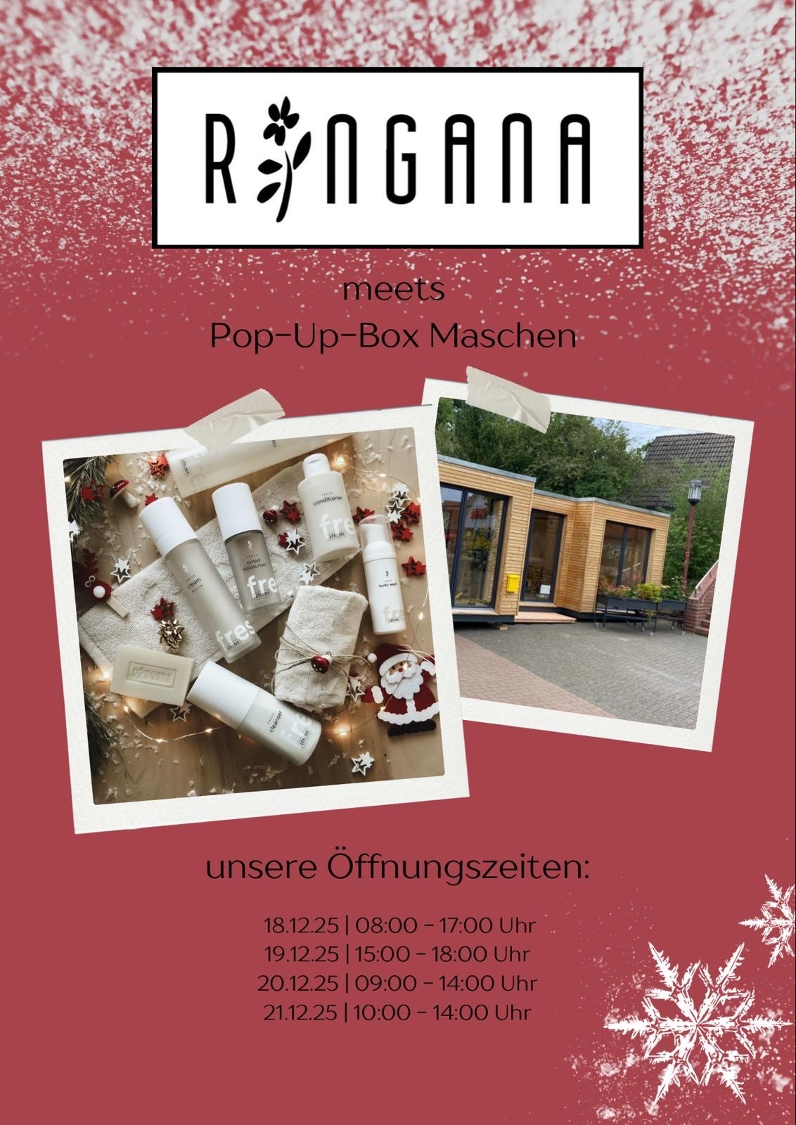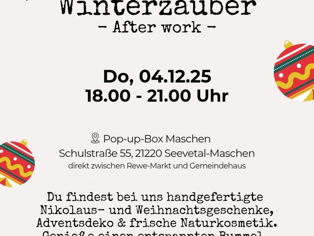 Um den Zeitraum des vorweihnachtlichen Geschehens auf dem Maschener Dorfplatz zu verlängern, wird es bereits am Donnerstag, den 4. Dezember in der Pop-up-Box den „Winterzauber – After work“ geben. Ab 18 Uhr gibt es bei Punsch und Keksen handgefertigte Nikolaus- und Weihnachtsgeschenke, Adventsdekoration, Kosmetik und vieles mehr.