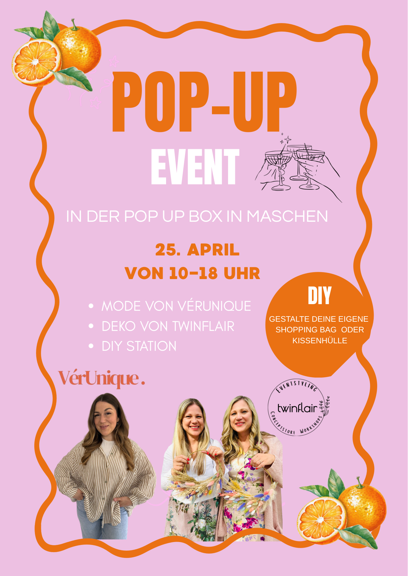 Am Samstag, den 25. April, lädt ein liebevoll gestaltetes Pop-up-Event in die Pop Up Box in Maschen ein. Von 10 bis 18 Uhr erwartet die Besucherinnen und Besucher eine besondere Auswahl an Mode von VérUnique sowie stilvolle Deko von twinflair. Zusätzlich gibt es eine kreative DIY-Station, an der eigene Shopping Bags oder Kissenhüllen gestaltet werden können - perfekt für alle, die gerne selbst kreativ werden.